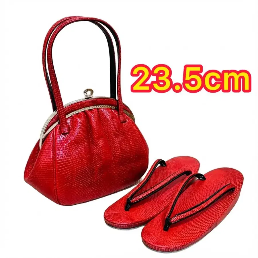 #ぱりんこの和装 ←기모노 관련 상품은 이쪽에서 보실 수 있습니다. 선명한 빨간색이 눈길을 끄는, 리자드 (도마뱀) 패턴의 조리와 백 세트입니다. 어머니께서 혼수품으로 맞추신 상품으로, 미사용 상태로 소중히 자택 보관해 왔습니다. 최근 성인식에서 인기 있는 [레트로 모던]이나 [모노톤 코디]에 잘 어울리는, 빨간색 x 검은색 대비가 아름다운 디자인입니다. 다른 사람과 겹치기 어렵고, 개성 있는 후리소데 스타일을 찾으시는 분께 추천합니다. ■ 소재에 대하여 표면에는 리자드풍의 섬세한 비늘 무늬가 시공되어 있습니다. 소재의 상세는 불명이나, 외관이나 질감에서는 저렴한 엠보 가공과는 다른, 확실한 중후한 느낌이 있습니다. 당시 혼수품으로 맞추신 상품입니다. ■ 사이즈 사양 ※ 개인 측정으로 약간의 오차는 양해 부탁드립니다. [ 조리 ] 사이즈: 약 23.5cm 발꿈치 높이: 약 4.5cm (바닥에서 가장 높은 부분까지) [ 백 ] 폭: 약 13~23cm 높이: 약 19cm (손잡이 제외) 바닥 폭: 약 7cm 색상: 빨간색 x 검은색 (손잡이, 하나오는 에나멜풍) ■ 상태 조리 밑면에 장기 보관으로 인한 얼룩이 있습니다. 그 외, 눈에 띄는 상처나 끈적임은 없으며, 전반적으로 매우 깨끗한 상태입니다. ※ 장기 보관품에 이해가 있는 분만 구매 부탁드립니다. ■ 추천 장면 성인식 / 졸업식 / 사전 촬영 / 하카마 / 빈티지풍 코디 / 결혼식 / 피로연 ※ 가격 인하, 낱개 판매 불가 ※ 방수 대책을 하여 정성껏 포장하여 발송합니다. ※ 구매 전 프로필란을 확인해 주세요.