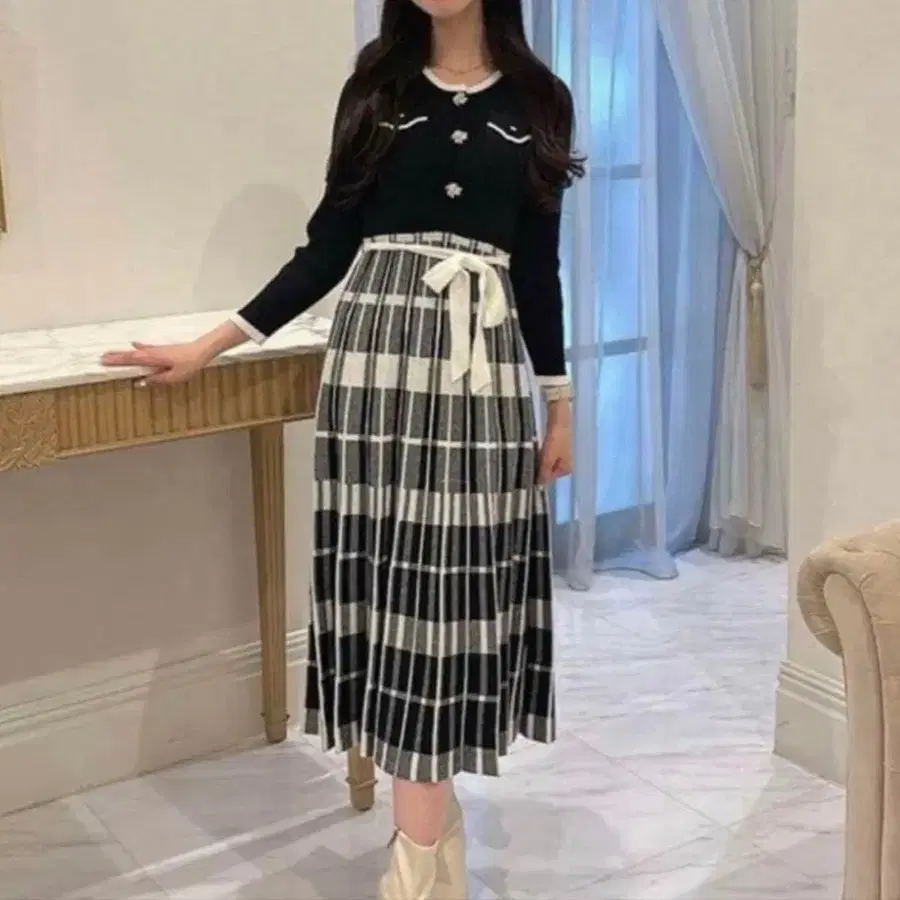 An MILLE 비쥬 체크 니트 원피스 안미르
