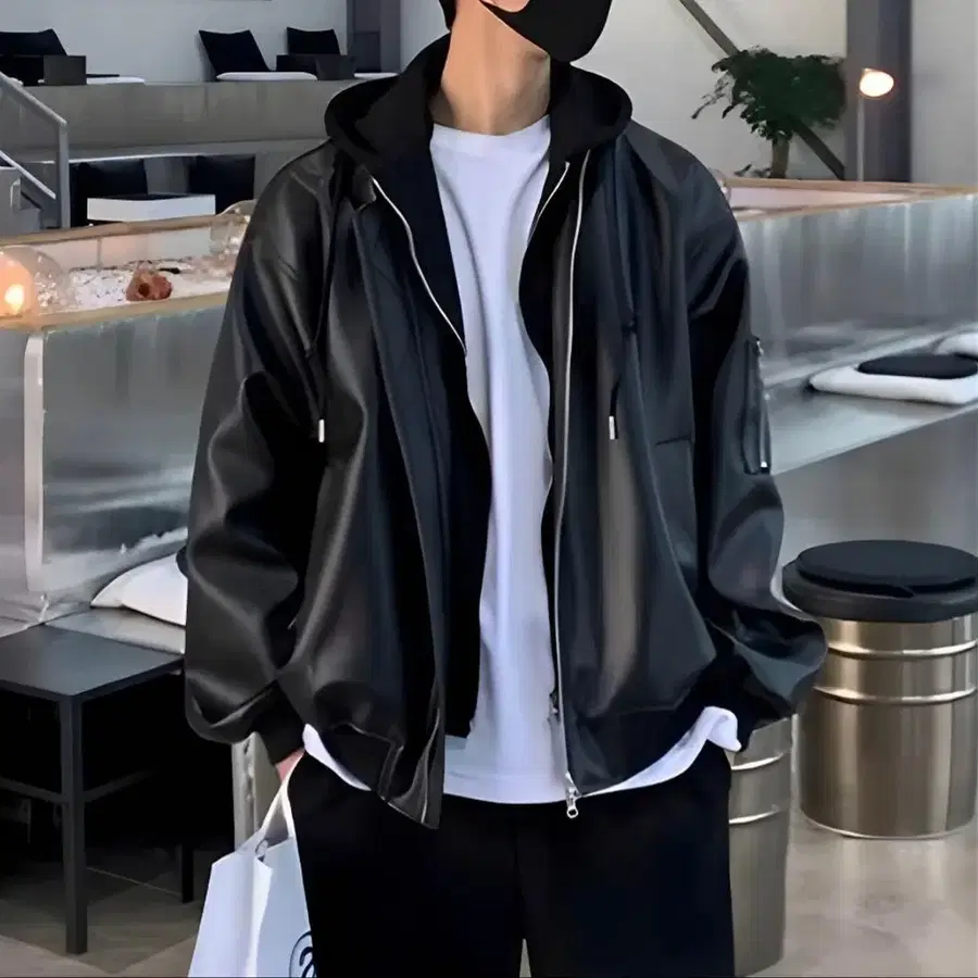 후드 부착 바시티 자켓 PU 가죽 자켓