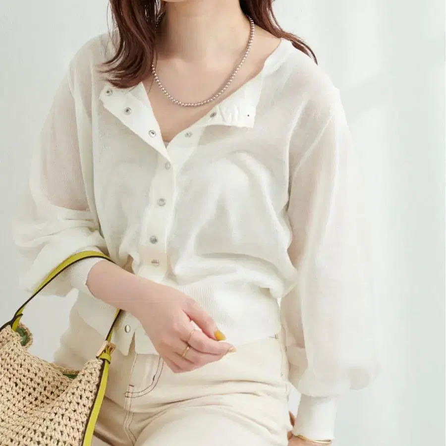natural couture (내추럴 꾸뛰르) 도트 단추 시어 가디건 1회 단시간 착용했습니다. 여름철 냉방병 예방, 자외선 차단에 가볍고 산뜻하게 걸치기 좋은 겉옷으로 유용합니다(^^) ■ Design 적당한 시어한 느낌과 탄력 있는 고급스러운 성인 가디건입니다. 단추를 열어 가디건으로 입는 것은 물론, 앞을 잠가 풀오버로 착용하는 것도 추천합니다. 은은하게 존재감 있는 도트 단추가 베이직한 디자인에 악센트를 더해줍니다. 풍성한 볼륨 소매가 트렌디한 느낌을 연출해 줍니다. ■ Styling 베이직한 크루넥 가디건이므로, 슬리브리스나 반팔 겉옷에는 물론, 숄더 등으로 코디네이트에 악센트를 더하는 것도 추천합니다. 아크릴 84% 폴리에스테르 16% [ 사이즈 ] 기장 소매 길이 어깨 너비 가슴둘레 51 52.5 38 100 1220 6