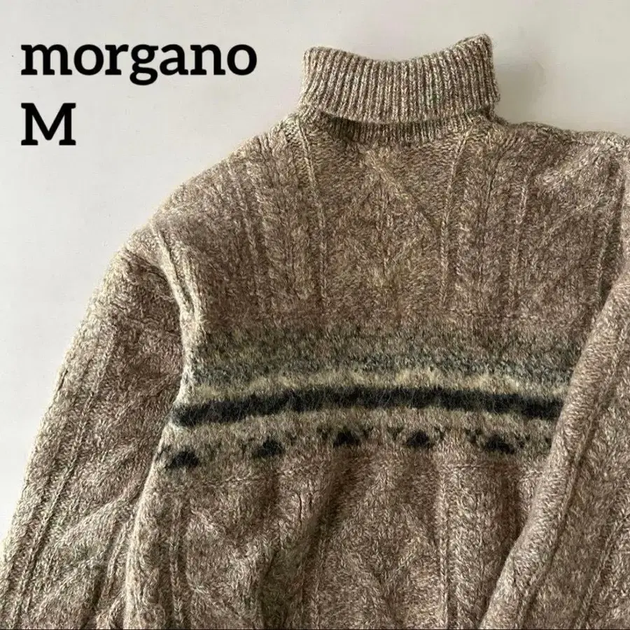 모르가노의 베이지 터틀넥 케이블 짜임 스웨터입니다. 스트라이프 무늬가 특징입니다.