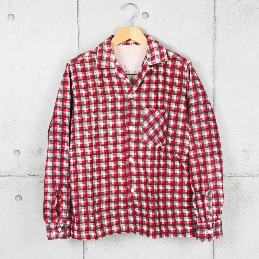 1950-60년대 오픈 카라 프린트 플란넬 셔츠 레드 x 화이트 M 상당