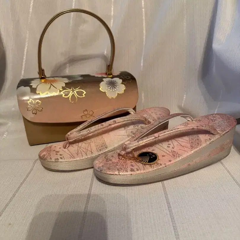 핑크 꽃무늬 조리와 골드 핸드백 세트 후리소데 도쿄 시바야마