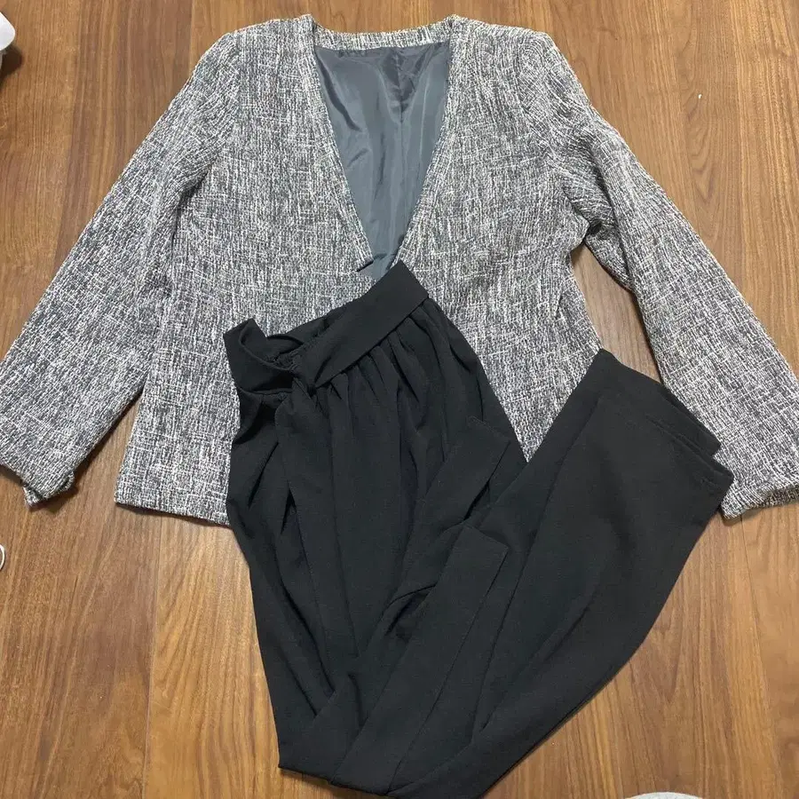 그레이 계열 노카라 V넥 자켓과 팬츠 세트
