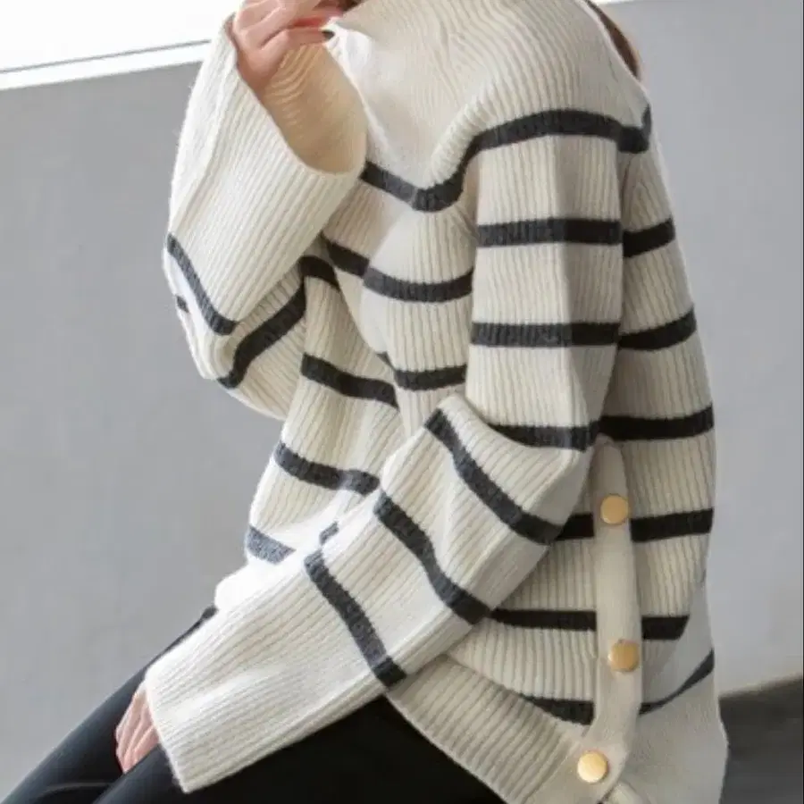 NOBLE 노블 라무즈울 보더 니트 골드 버튼 울 100%