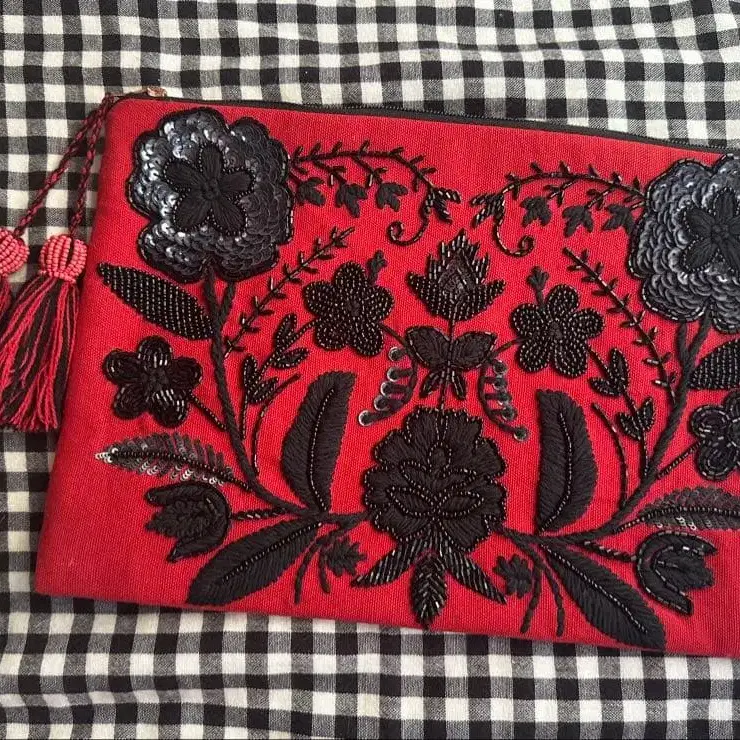 자동 번역되었어요. 원문보기빨간색 패브릭 소재 파우치에 블랙 스팽글 자수와 태슬이 특징입니다.