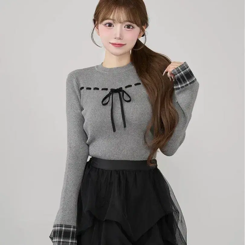 다리치 체크 커프스 리본 니트탑 GRY