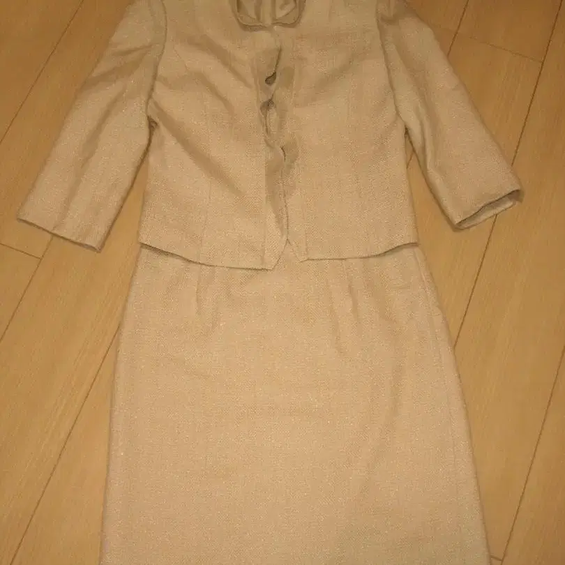 심플한 반팔 원피스와 프릴 자켓에 실버 라메를 짜넣은 고급스러운 사계절 활약하는 트위드 원단이므로, 하나 있으면 매우 유용합니다. 베이지 베이스에 라메가 적당히 반짝임을 더해 화려한 인상입니다. 원피스, 자켓 각각 5만 엔 이상이므로 매우 저렴합니다.