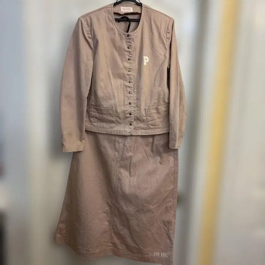 코튼 소재의 베이지 셋업으로, PINK HOUSE 로고가 있습니다.