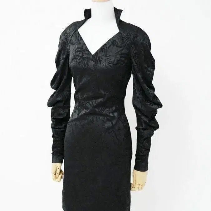 2007년 데뷔. 세련된 디자인과 아름다운 커팅이 매력적인 NY 브랜드 [ 루빈싱거 RUBINSINGER ]의 의상. USA (NY) 제조. 고급스러움과 모드 스타일을 겸비한 블랙 드레스. 광택이 있는 자카드 원단을 사용한 엘레강트한 분위기의 미니 드레스. 깊은 V 넥라인과 스탠딩 칼라풍 디자인이 목선을 깔끔하게 보이게 하여 세련된 인상을 연출합니다. 바디라인을 따라 흐르는 타이트한 실루엣에 볼륨감 있는 개더가 들어간 긴팔을 매치하여 클래시컬하면서도 스타일리시한 밸런스를 완성했습니다. 무릎 위 기장으로 다리를 아름답게 보이게 하면서도 포멀한 장면에 잘 어울리는 의상입니다. 미사용 택 포함으로 깨끗한 상태입니다. 사진으로 상태를 확인하신 후 구매 부탁드립니다. ◆ 브랜드명 : 루빈싱거 RUBINSINGER ◆ 표기 사이즈 : 2 ◆ 실측 사이즈 기장 : 약 89cm 화장 : 약 107cm 가슴 너비 : 약 39cm 소매 아래 길이 : 약 46cm 허리 : 약 60cm 힙 너비 : 약 43cm 개인 측정이라 약간의 오차가 있을 수 있습니다. ◆ 소재 폴리에스테르 80%, 나일론 20% 무릎 기장 긴팔 고져스 타이트 V넥 로브 데콜테 스탠딩 칼라 개더 볼륨 소매 클래시컬 모드 스타일 색상 - 블랙 얼룩, 찢김, 냄새 등 - 없음 A11 81 사이즈 - M 색상 - 블랙 계열