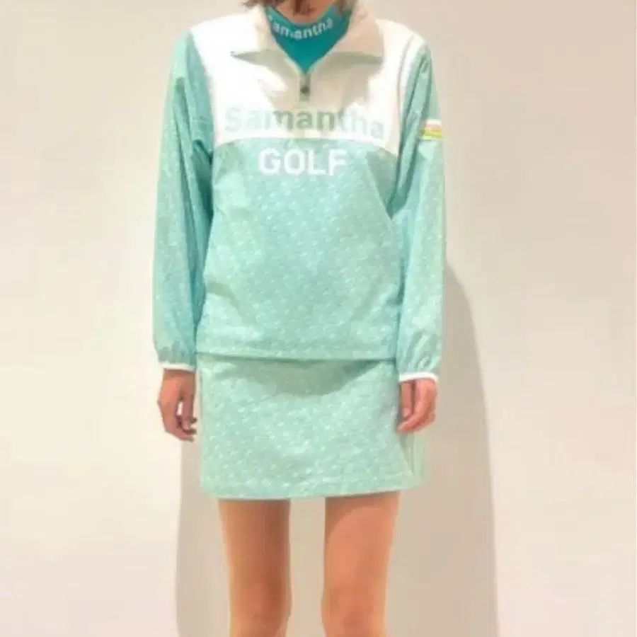 민트 그린의 하프 지퍼 골프 자켓, 로고가 있어 스타일리시합니다.