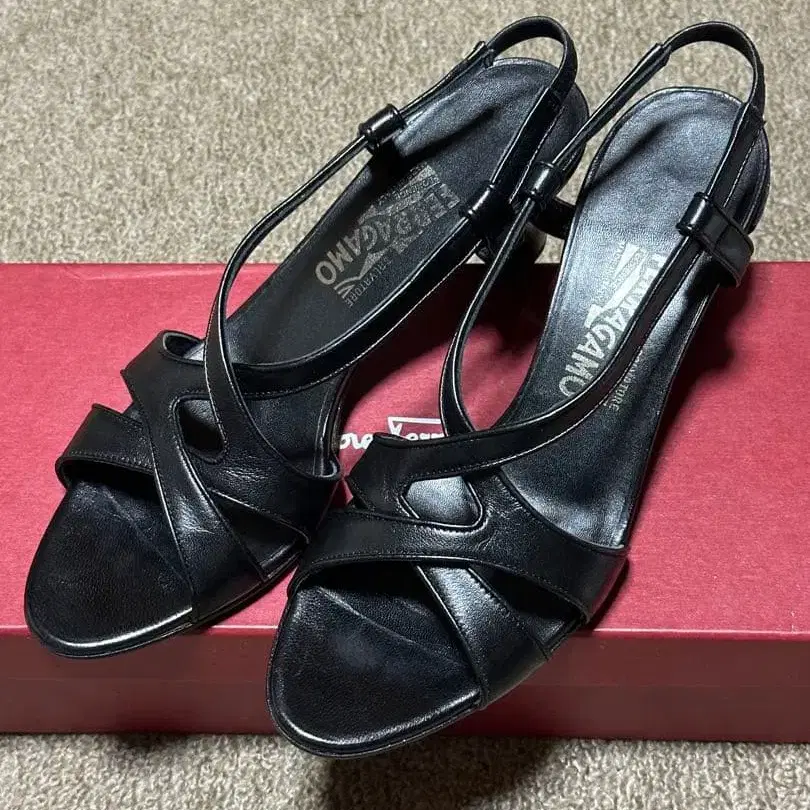 새상품급 Ferragamo 블랙 가죽 스트랩 샌들 중간 힐