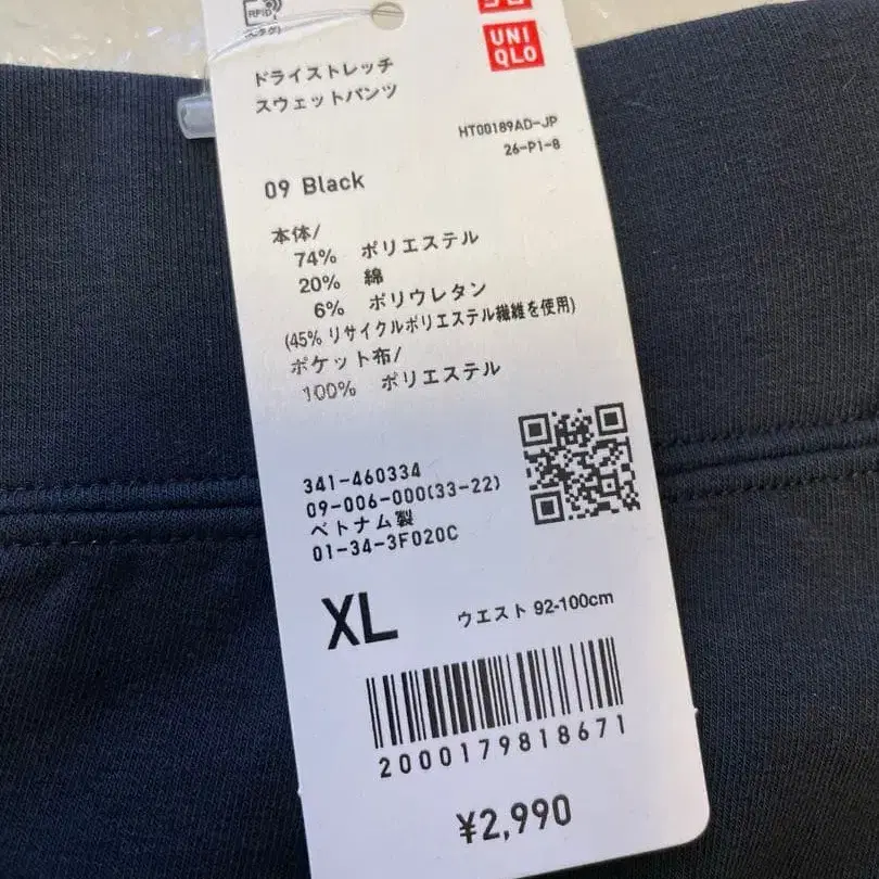 미사용 새상품 UNIQLO 블랙 드라이 스트레치 스웨트 팬츠 XL