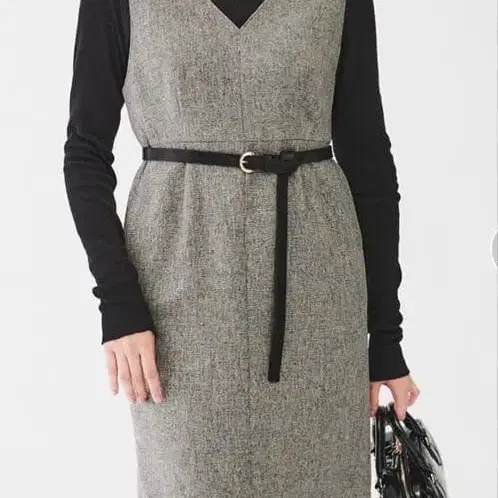 V넥과 세로로 긴 실루엣이 포인트인 오버롤 스커트.