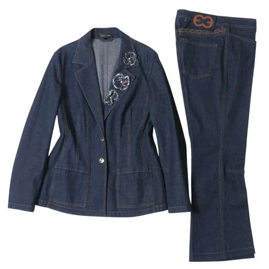 에스카다 데님 셋업 수트 부츠컷 팬츠 플라워 장식