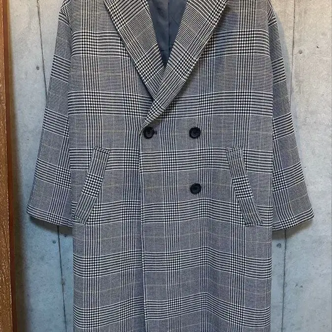 자동 번역되었어요. 원문보기그레이 계열 체크 무늬 더블 브레스트 코트, 스타일리시한 디자인.