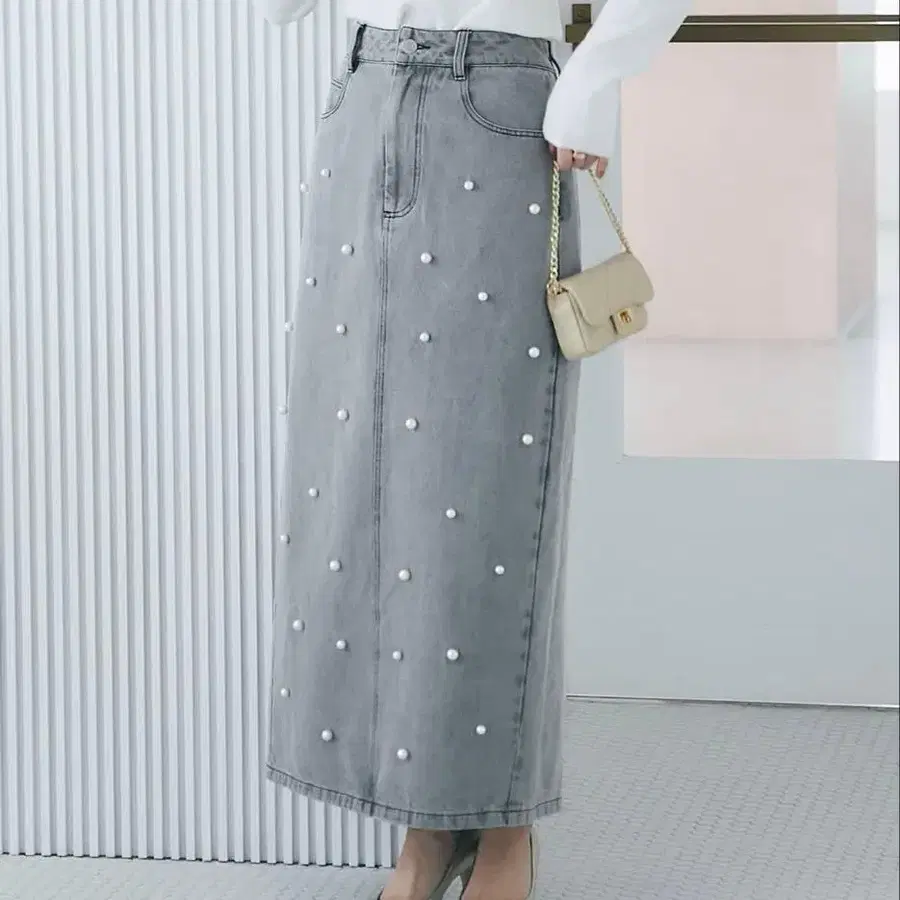 빈티지한 느낌의 데님에 크고 작은 펄을 전신에 장식한 데님 스커트.