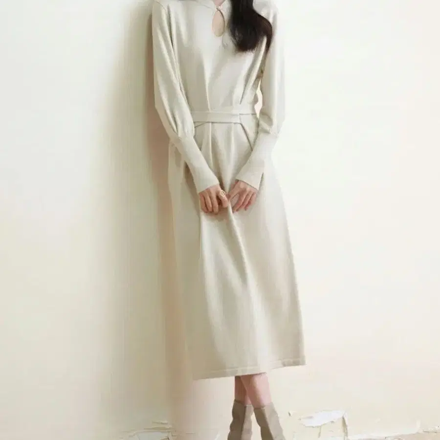 베이지 롱 니트 원피스 허리 리본 포함