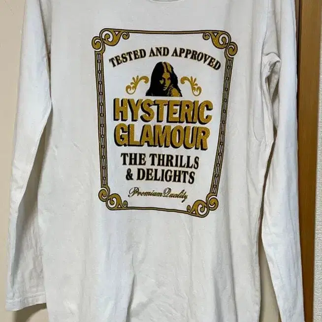 화이트 색상의 긴팔 T셔츠, 프린트 디자인 포함.