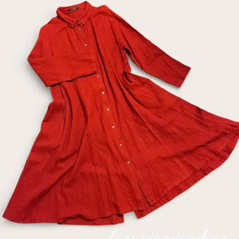 **LeFluy (르 플루이)**의 셔츠 원피스입니다. 깊이 있는 빨간색이 눈길을 끄는, 일본제 고급 의류입니다.