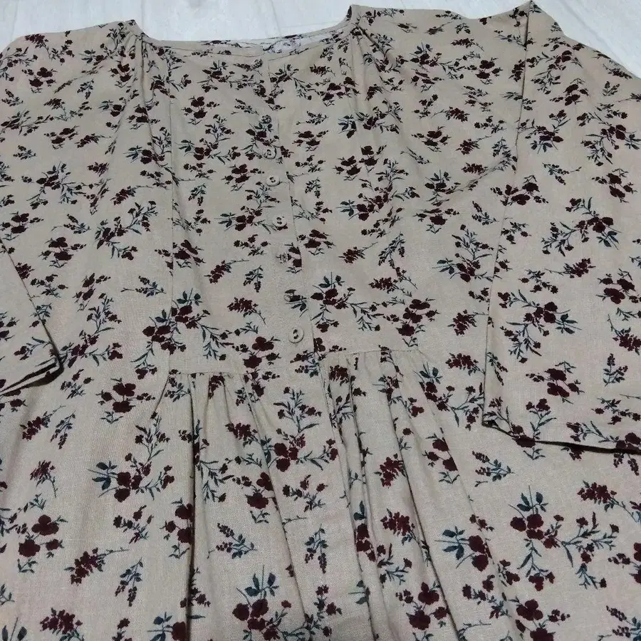 사만사 모스모스 꽃무늬 긴팔 원피스 베이지 계열에 빨간색 꽃무늬