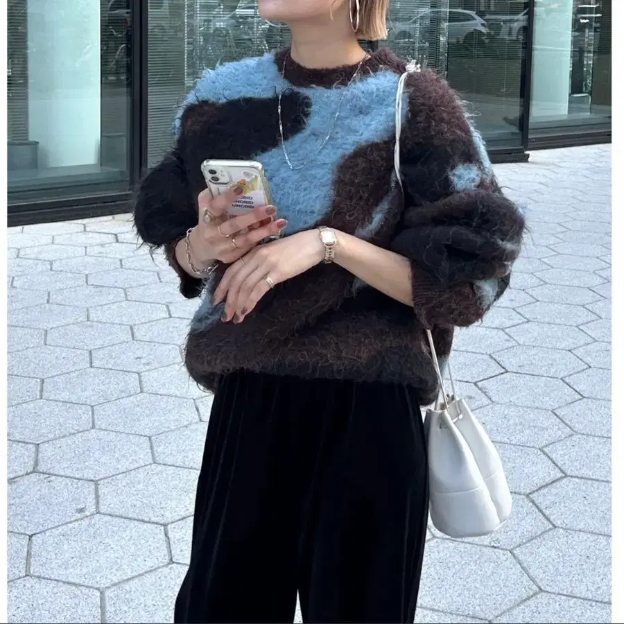 ungrid 뉘앙스 패턴 샤기 재규어 니트 브라운 스카이블루