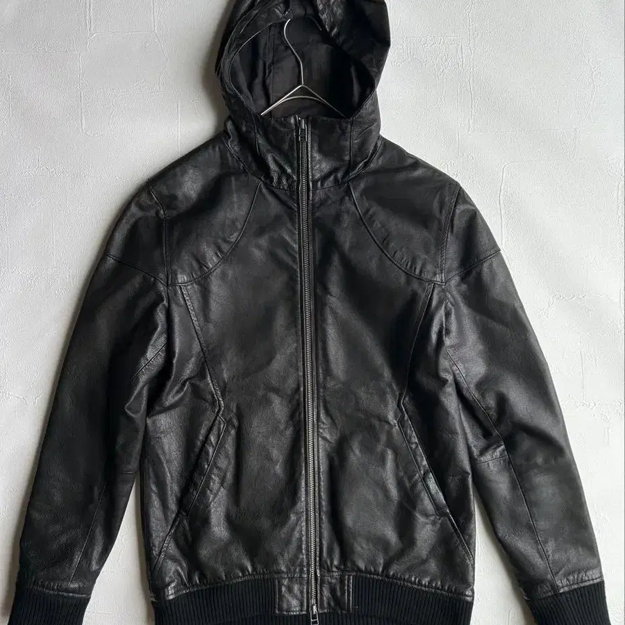 and A의 후드 부착 가죽 자켓입니다. 블랙 색상으로 코디하기 쉬우며, 집업 사양이라 겉옷으로도 활용하기 좋은 아이템입니다. 소매와 밑단은 리브로 되어 있어 적당히 핏되며 바람이 통과하기 어려운 디자인입니다.