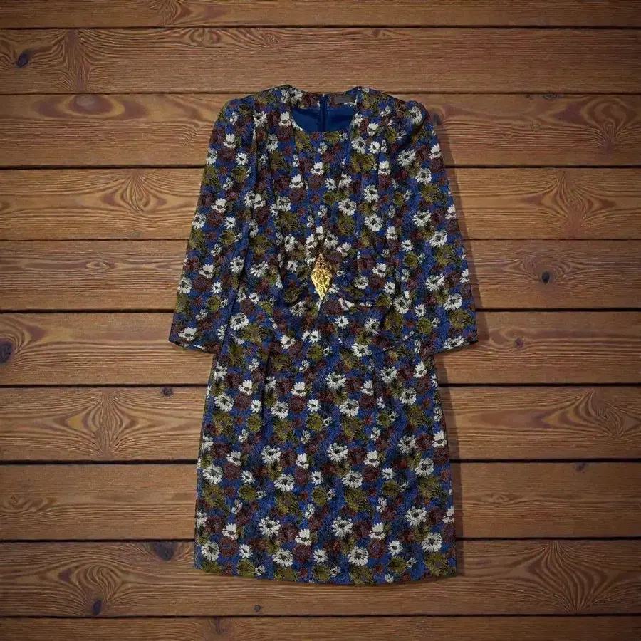 원피스 꽃무늬 레트로 블루 골드 장식 긴팔 안감 부착 고급스러운
