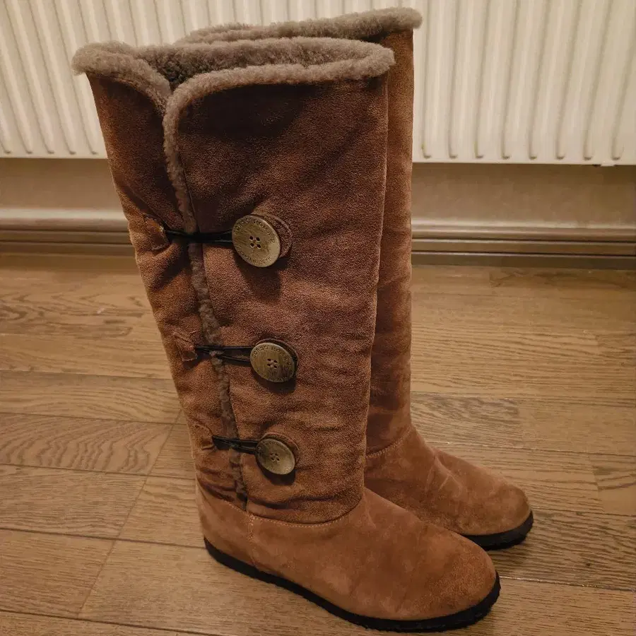 스웨이드 소재의 브라운 롱 부츠, 안쪽은 퍼가 있어 캐주얼한 스타일에 최적.