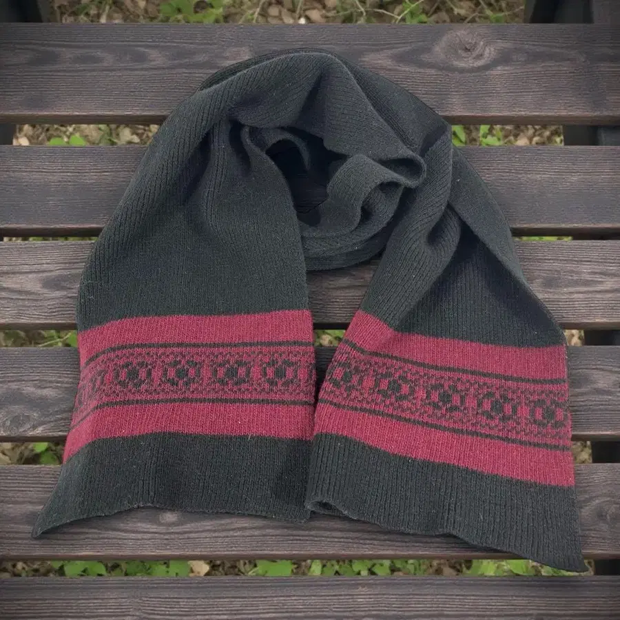 검정색과 빨간색의 뜨개질 무늬가 특징인 머플러입니다.