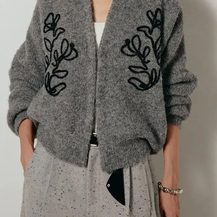 3G 부클레 니트 꽃무늬 테이프 자수 후크 개폐 가디건