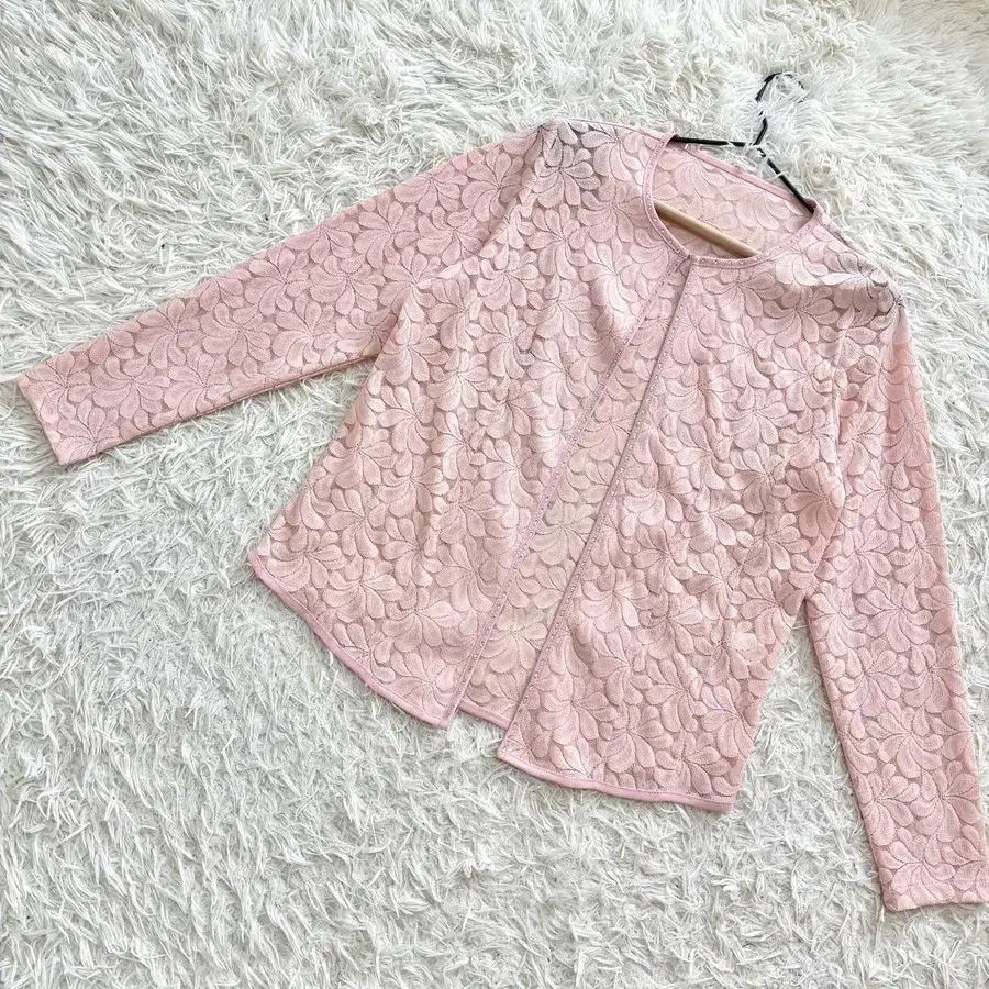 • 핑크 레이스 꽃무늬 자수 모티브 가디건 입체 3D 시스루 펄