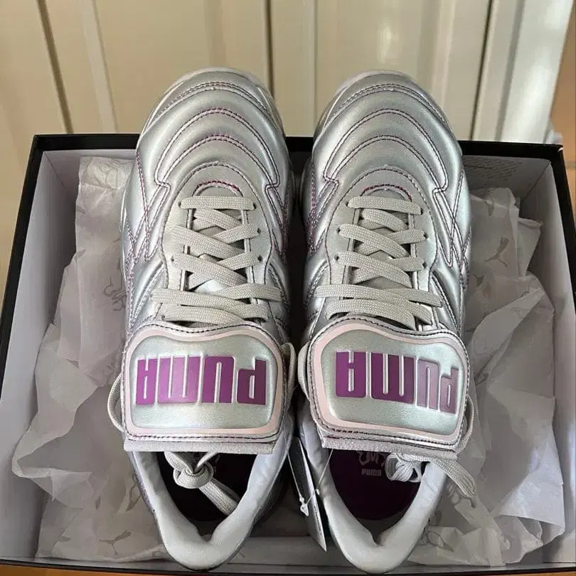 실버와 퍼플 로고가 들어간 PUMA 스니커즈, 박스 포함 스타일리시한 디자인.