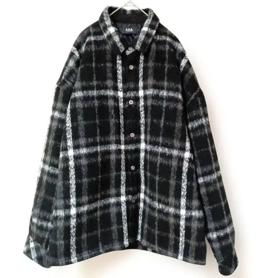 플란넬 소재의 샤기 체크 무늬 자켓, 블랙과 화이트의 대비가 특징.