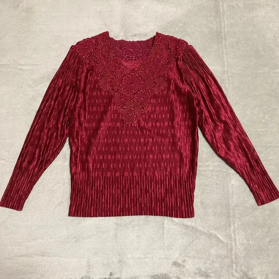 버건디 꽃무늬 자수 긴팔 상의 플리츠 가공 소재 V넥 화려함