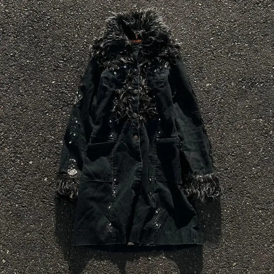 퍼 트리밍 블랙 데님 롱 코트 시크 스타일 그런지