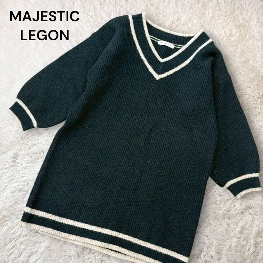 마제스틱 레곤 트레디셔널 V넥 니트 원피스 바이컬러 라인 짙은 녹색