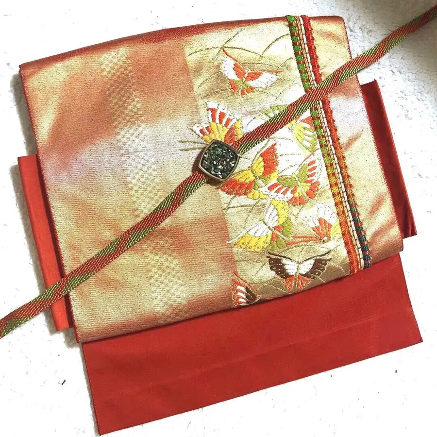 빈티지 순수 실크 니부시키 나고야 오비 주황 x 골드 화려한 나비