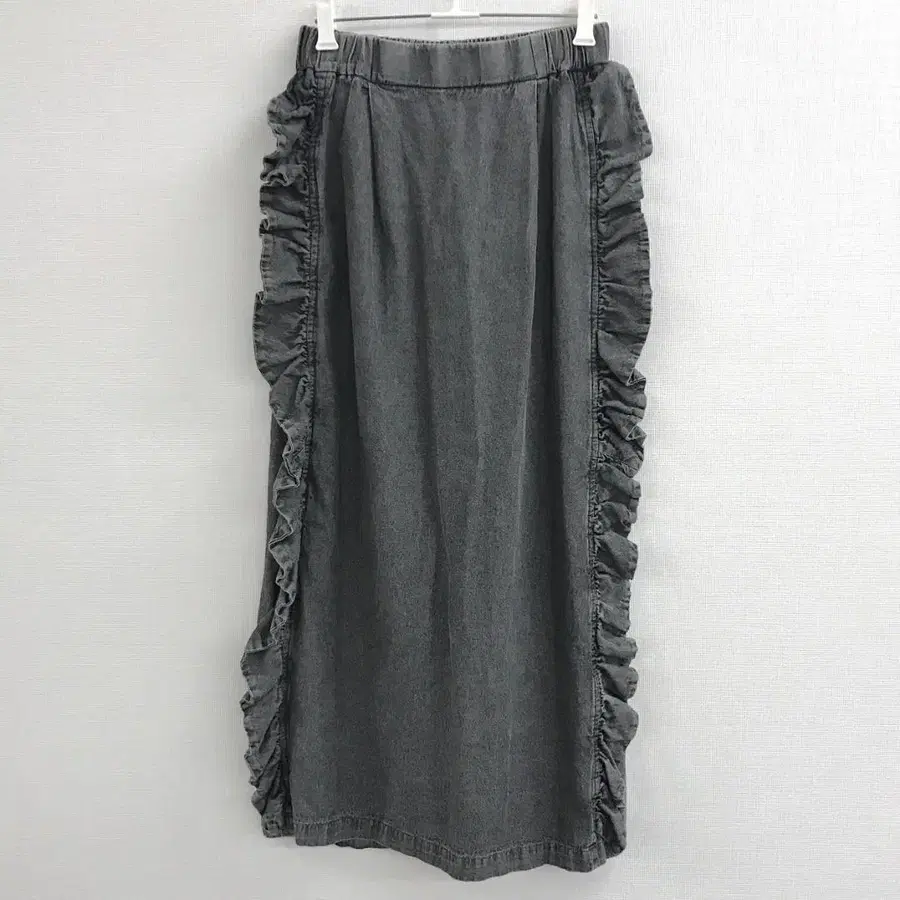 프릴 디자인의 그레이 롱 스커트, 데님풍 소재로 캐주얼하게 연출할 수 있습니다.