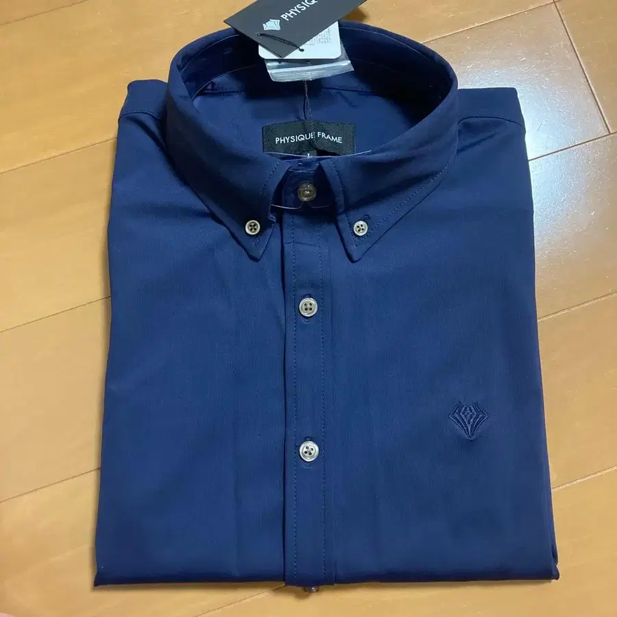 네이비 색상의 버튼다운 셔츠, L 사이즈, 나일론 86%, 폴리우레탄 14% 소재입니다.