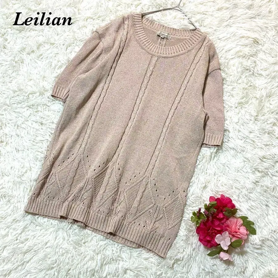 핑크 계열의 니트 원피스, 케이블 짜임 디테일이 특징입니다.