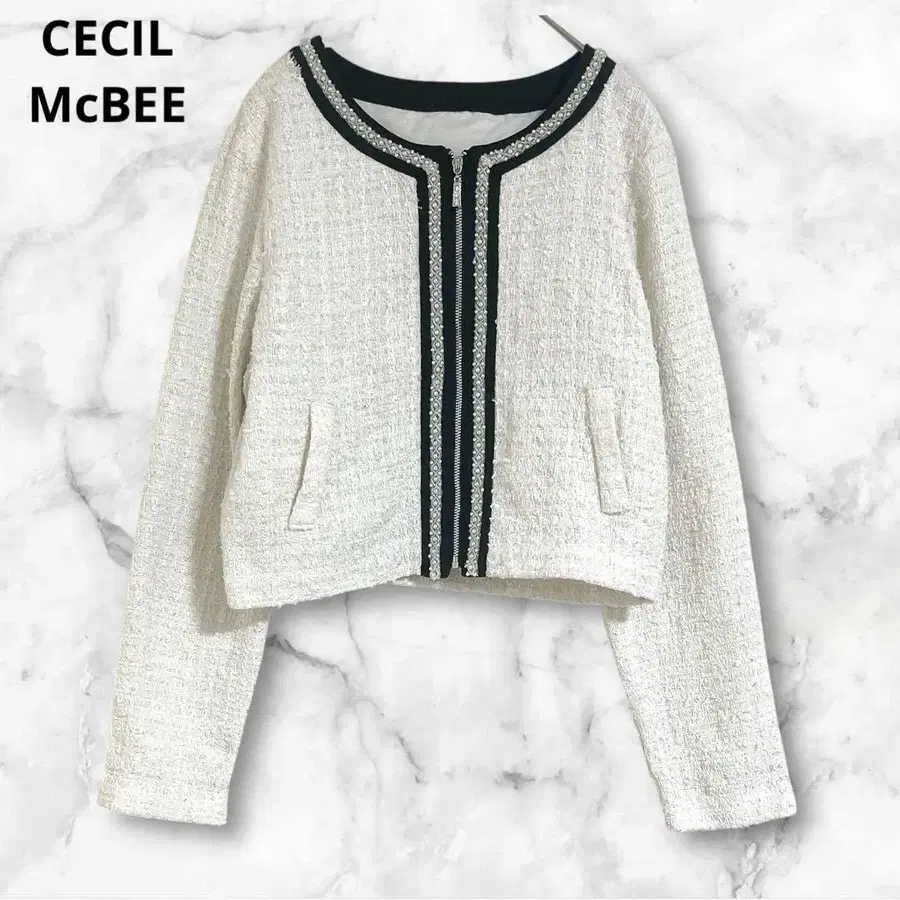 세실 맥비 화이트 트위드풍 노카라 자켓 M 긴팔 숏 기장