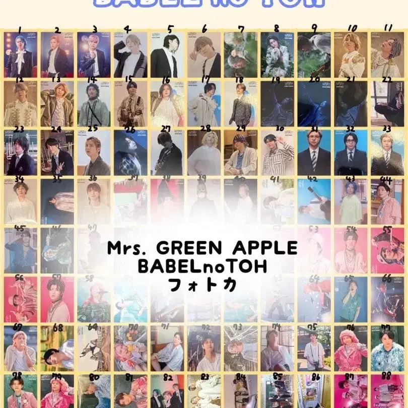 Mrs. GREEN APPLE BABELnoTOH 포토 카드 중복입니다(*^^*) ★ 개봉 후 슬리브에 넣어 보관하고 있습니다! (1) 3장 (2) 1장 (4) 2장 (5) 4장 (7) 2장 (9) 1장 (10) 2장 (12) 2장 (15) 1장 (16) 2장 (18) 1장 (19) 2장 (21) 2장 (22) 1장 (23) 1장 (24) 2장 (25) 1장 (28) 2장 (29) 1장 (30) 1장 (32) 1장 (34) 1장 (36) 1장 (37) 1장 (39) 1장 (40) 1장 (43) 1장 (44) 1장 (50) 1장 (51) 1장 (52) 4장 (53) 1장 (54) 3장 (57) 1장 (58) 3장 (59) 3장 (60) 1장 (61) 1장 (62) 1장 (63) 3장 (65) 2장 (66) 1장 (68) 4장 (69) 2장 (70) 2장 (72) 2장 (73) 2장 (74) 2장 (75) 2장 (79) 1장 (80) 1장 (84) 1장 (86) 3장 (88) 2장 (89) 1장 (91) 1장 (92) 2장 (93) 1장 (94) 3장 (95) 1장 ★ 와카이 히로토 & 후지사와 료카 1장 130엔 오오모리 모토타카 & 단체 사진 1장 300엔 ⚠︎ (23) 700엔 (32) 800엔 (50) 600엔 ⤴ ︎ 해당 카드만 가격 변경 있음 ⚠︎ ⚠︎ 발송 방법 유패킷 포스트 미니 원하는 카드 + 배송비 160엔 부탁드립니다 (침수 방지, 파손 방지로 포장해 드리겠습니다!) ⚠︎ 300엔 이상이 되도록 부탁드립니다 ( ♡ ᴗ͈ˬᴗ͈) #오오모리모토타카 #와카이히로토 #후지사와료카 #미세스 #바벨
