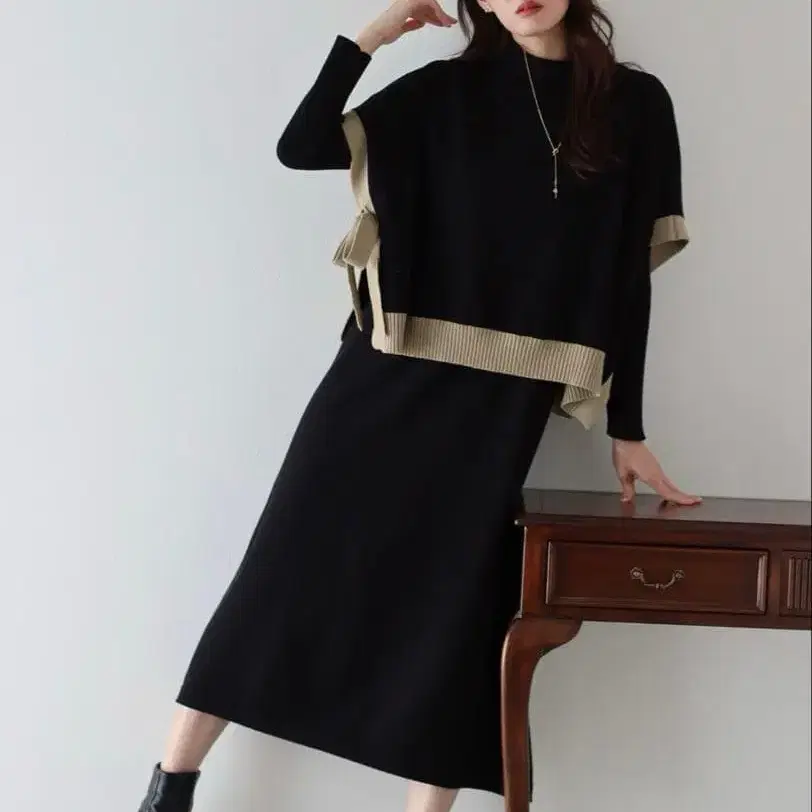 와이드 실루엣의 니트 베스트 & 원피스 레이어드 세트