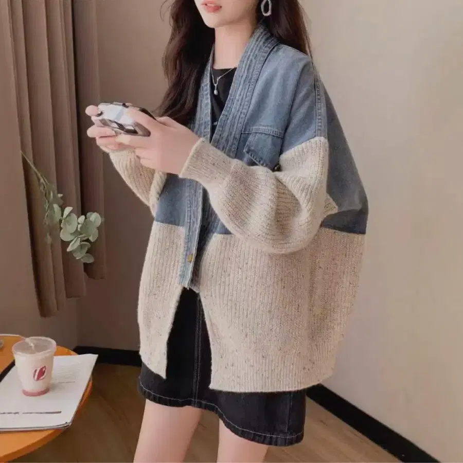 데님 절개 네프 니트 가디건 캐주얼 겉옷 뤼미에 같은 형태