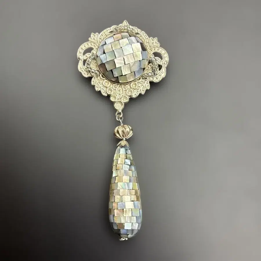 나전칠기 오버사이즈 드롭형 브로치 모자이크 모양 모조개 실버색