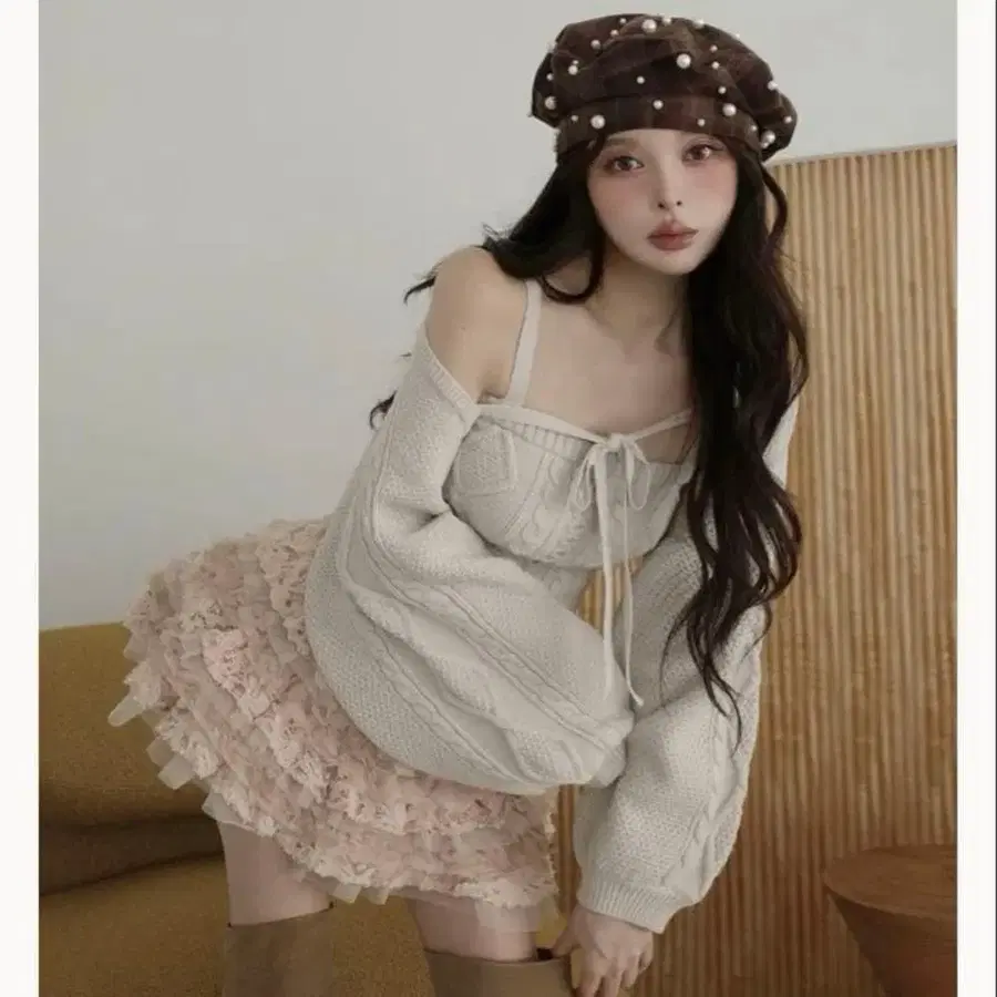 [택 포함 미사용] 다리치 케이블 숏 니트 앙상블