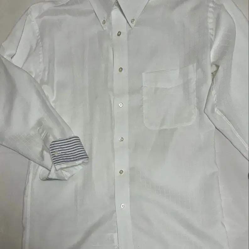 자동 번역되었어요. 원문보기스트라이프 옷깃이 특징인 화이트 드레스 셔츠. 약간의 광택 있음.