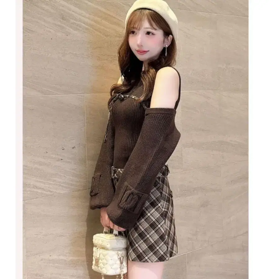 빅 리본 벌룬 체크 미니 원피스, 체크 자카드 슬리브리스 니트 미니 원피스.