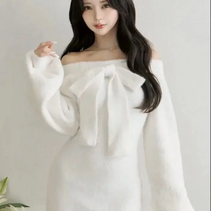 다리치 후디 오프숄더 니트 미니 원피스 화이트